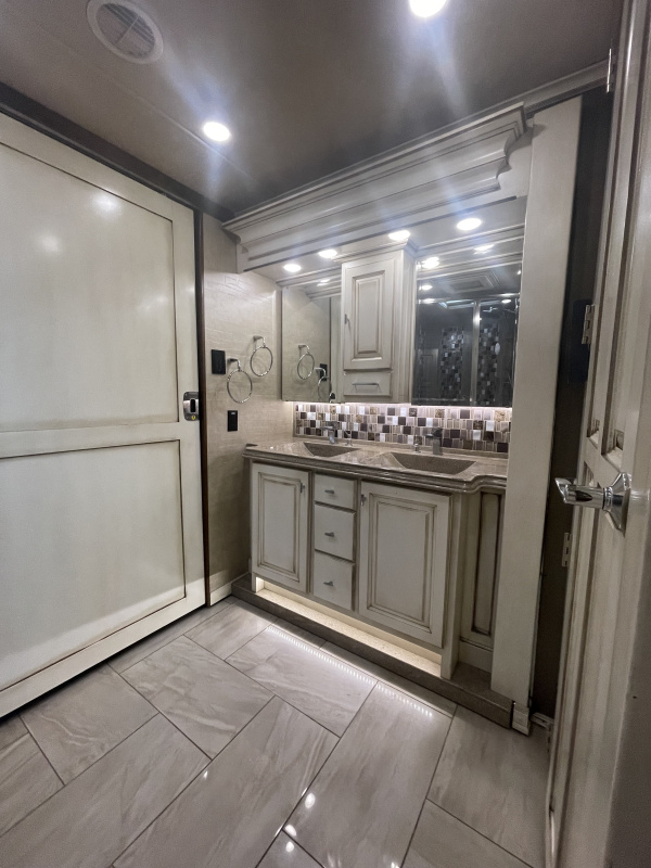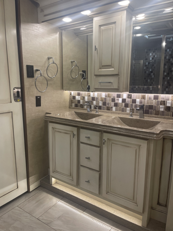 - Dual Sink Vanity with Antique White Cabinets