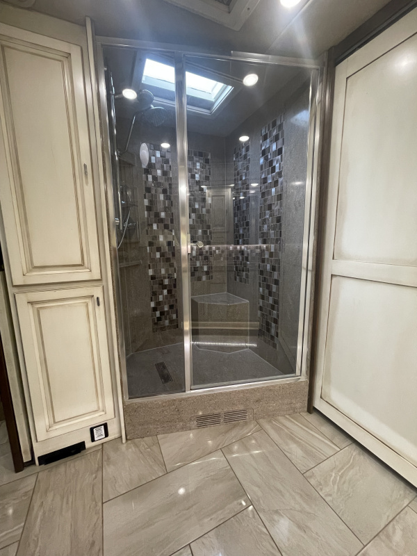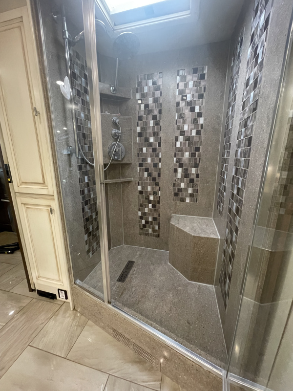 - Glass door with huge walk-in Shower and seat